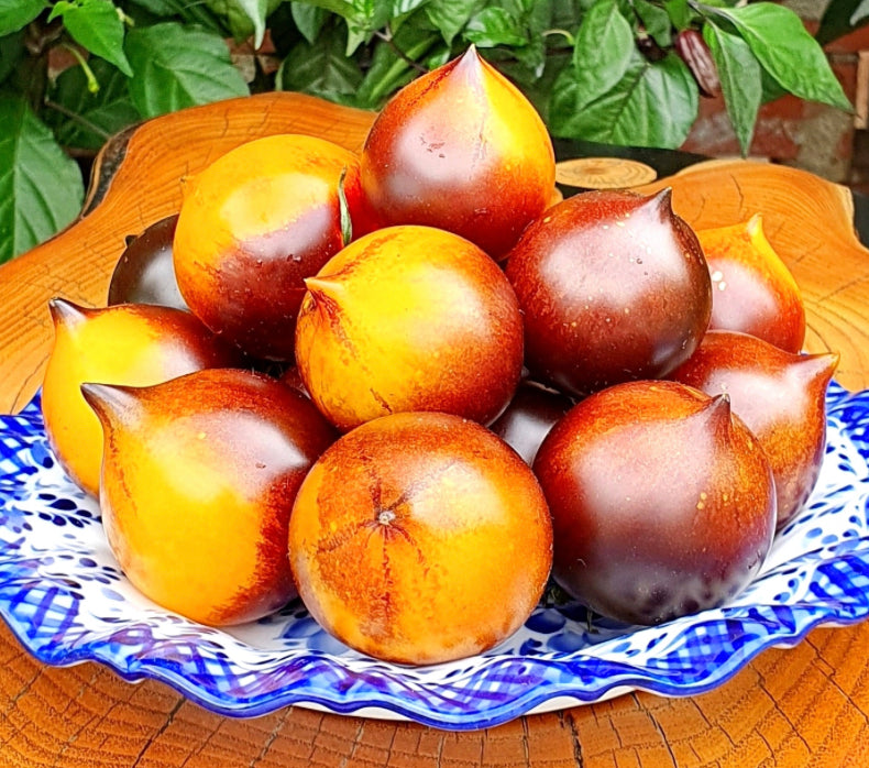Indeterminate, regular leaf plant. Heart shaped yellow tomato with blue portion. Exceptionally pretty. Refreshing, juicy, fine acidity, good sweetness. Perfect and balanced tasting. A fruit is about 80 gr heavy.