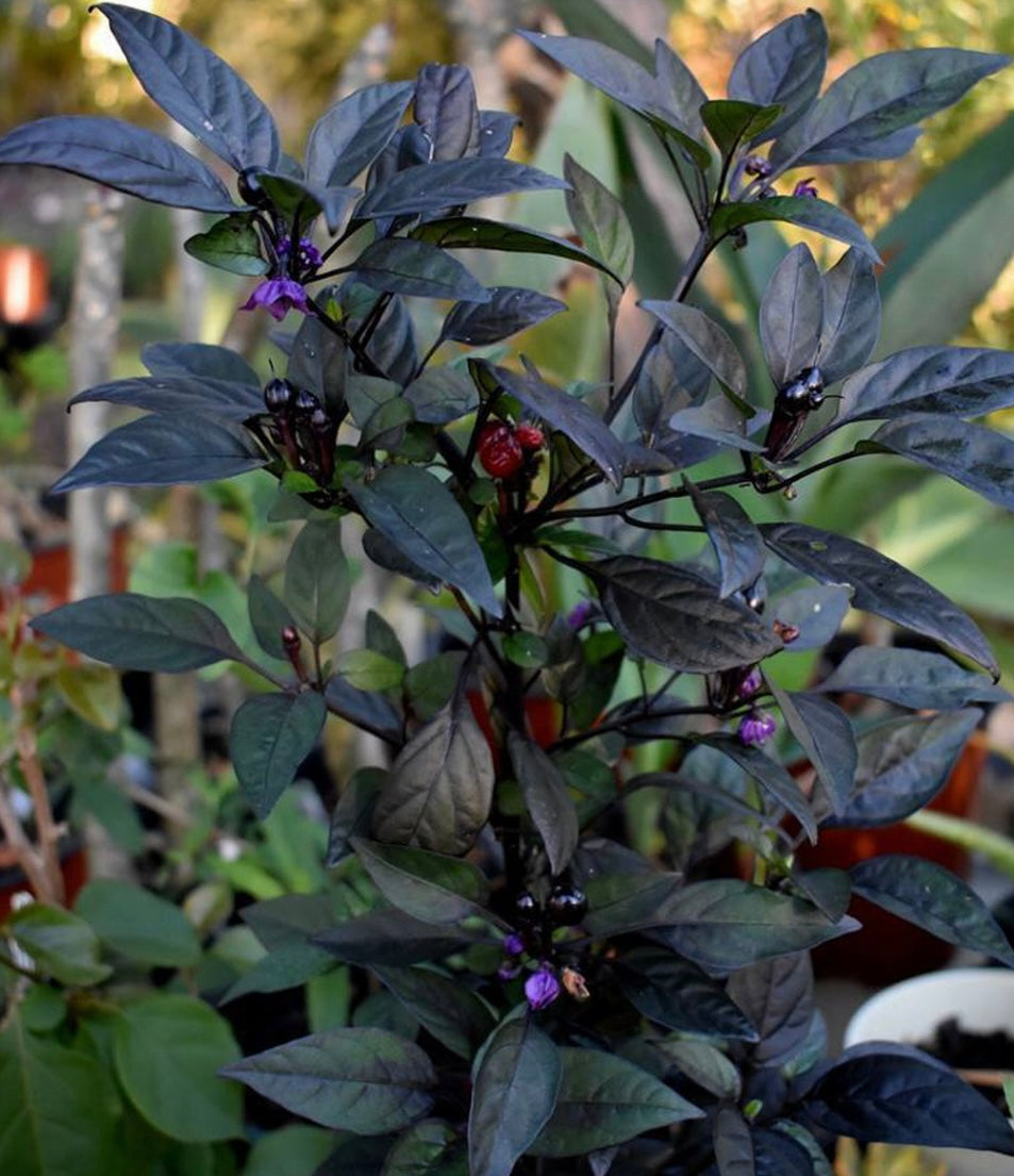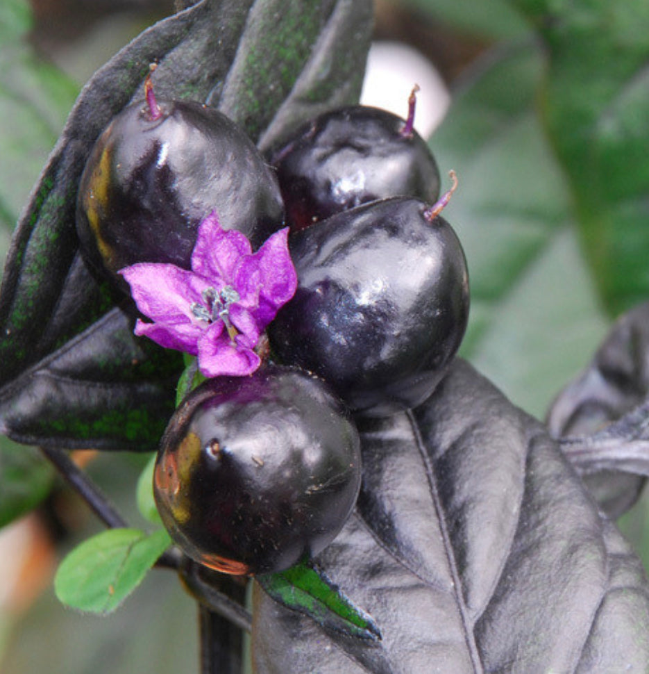 The black pearl pepper is an AAS winning chili variety with dark foliage and purple flowers. Fruits are berry-shaped and are very spicy!