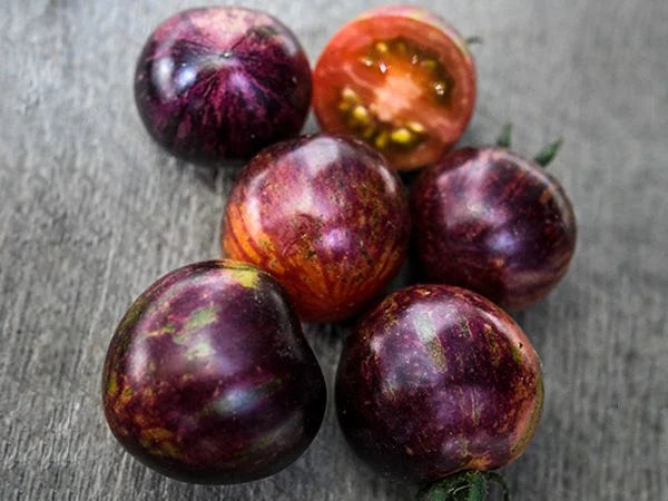 Fantastic, sugar-sweet tomato flavor, that is fruity, with a hint of grape and plum flavors. If you relish the experience of digging into a bowl of high-quality cocktail tomatoes, then the Black Strawberry is your tomato. This 1-ounce fruit is marbled in blue, scarlet and gold. A bowl full resembles a luminous and luxurious bunch of gems, and indeed the flavor is decadent and indulgent, with perfectly sweet and tart balanced flavor! This extremely productive and early variety makes it an obvious choice for gardeners and market farmers who want rugged, early-producing plants, and do not want to sacrifice eating quality.