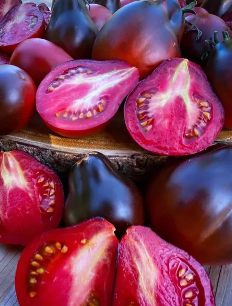 Absolutely stunning, large, pear-shaped fruits have deep purple shoulders and ripen to a beautiful burgandy base. Excellent, sweet, rich full-flavor with a meaty and tender texture. Thick walls make these shine whether eaten fresh, roasted or used for canning. Plants are large, grow wild, and reach both tall and wide while getting loaded with exotic fruits- will require good supports to promotoe good production!