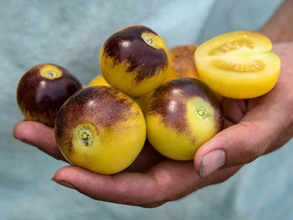 Superior breeding efforts have resulted in one of the most delectable and color-saturated tomatoes we have seen! Plants produce bunches of 2-inch globes, round and brilliant blue, maturing to a golden yellow with blue shoulders. This newer variety was introduced by J and L Gardens and is a cross between the famously sugary Amy’s Sugar Gem and the antioxidant-rich OSU Blue tomato. It is perfect to snack on or for salads and should be a centerpiece for market displays!