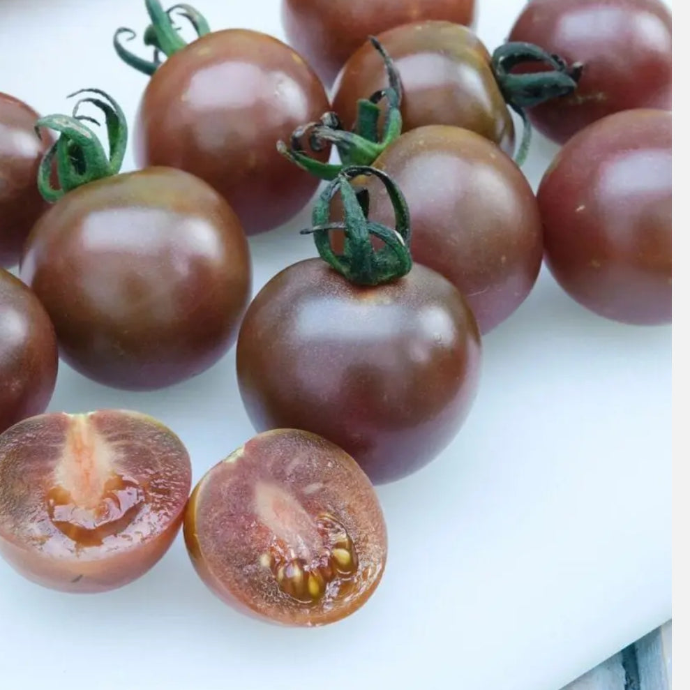 Indeterminate. Chocolate Cherry tomatoes are a unique heirloom that have a deep colour and complex flavour. 1-2 oz attractive brownish-red fruit is sweet & juicy with a refreshing flavour. Prolific 6-8' tall slender vines hold large trusses of seemingly endless fruit that will keep producing until the frost. Indeterminate tomato varieties must be pruned and trellised for ideal plant health and maximum fruit production. Benefits from starting indoors. Seed from small organic farm in British Columbia.