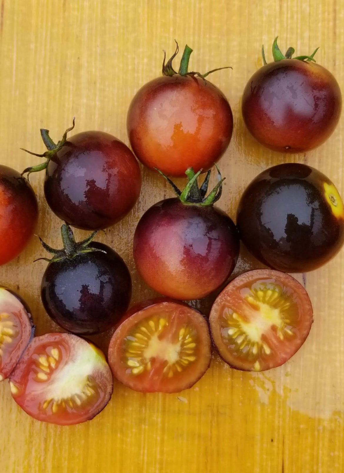 Delicious and very unique dark-purple topped red cherry tomatoes. Healthy, disease resistant plants have a purple blush and grow easily to 6 feet. A newer tomato color often referred to as indigo coloration.