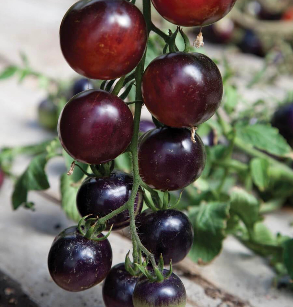 The tomatoes on this plant are about 2″ or so when ripe, so they’re a bit too big to be considered a cherry tomato.