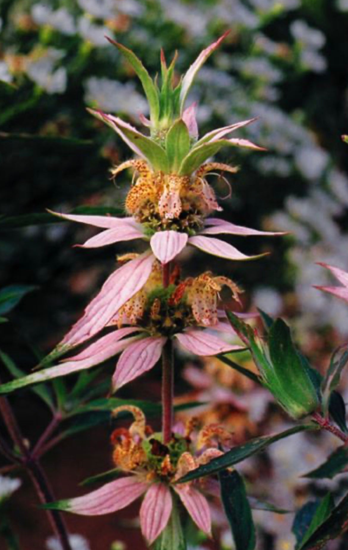 Dotted Mint (Monarda punctata) is beautiful, undemanding and edible. Native to the Eastern portion of Canada and the United States, the plant's leaves and flowers can be used to make an aromatic tea or as a savoury herb. Dotted mint is drought tolerant and although it prefers sand and loam, it will tolerate clay. Upon closer inspection, you'll notice that the plant has a row of flowers, and below what appear to be flower petals are actually colourful leaves, which may be purple, pink, green, white or yellow. Dotted mint is a favourite food source of the endangered Karner Blue Butterfly.