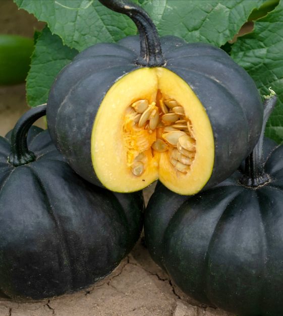 These 8-ounce to 1-pound, deep Brunswick green, just-shy-of-black Pumpkins are pint-sized, but they pack a big dramatic punch. They have a classic rounded, deeply ribbed shape and a black stem. Add these little devils to spooky fall displays, or use their sweet, pale orange flesh in your favorite Pumpkin pie recipe. They store well, eventually turning orange.
